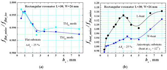 The main expected results in the research are included in this section. In the beginning, it is important to evaluate the effect of anisotropy in flat resonators. Figure 14a shows the simulated dependencies of the ratio fflat_aniso/fflat_iso between the resonance frequencies of modes TM10 and TM01 for flat rectangular resonators on anisotropic (ΔAε ~25%) and isotropic substrates versus the substrate thickness hs. The effect is visibly weak. Only for relatively thick substrates does the resonance frequency shift due to the anisotropy influence with 1–1.5%, which explains why this property is not so popular in the patch antenna design. The explanation is easy—the parallel E fields (to have a noticeable influence of the εpar component) appear only close to the edge of such wide planar structure and the relative effect is practically negligible in comparison to the microstrip line [26].