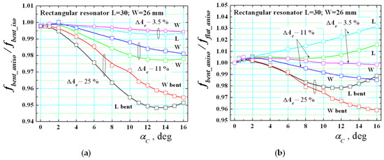 However, we expect a stronger effect when the resonators are bent. To perform deeper research, a set of bent resonators with different curvature angle are simulated by the help of the 3D models shown in Figure 9 and Figure 10. First, the ratio fbent_aniso/fbent_iso is shown in Figure 15a between the resonance frequencies of mode TM10 for L-/W-bent rectangular resonators versus the curvature angle αC. The substrate anisotropy ΔAε is chosen to be small (~3.5%), moderate (~11%) and big (~25%). This ratio is not measurable, but it shows in a pure form the effect of anisotropy in bent resonators. The results give the useful information, obtained for the first time, that this influence is considerably bigger in comparison with the flat case (up to −5% shifts down). One can see from the presented dependencies that the influence of the substrate anisotropy decreases the resonance frequency in comparison to the hypothetical case of an isotropic bent substrate. Therefore, we can conclude that the effect of the anisotropy of the substrate is just opposite to the effect of bending (as it is shown in Figure 11a). This was our preliminary hypothesis, and it can be considered as proven numerically. Therefore, one can expect that both effects can strongly change the behaviour of these dependencies.