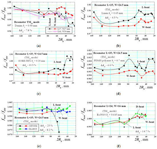 Let’s now present some experimental dependencies for bent resonators on anisotropic substrates, selected in Section 2.5. The measurement results for the ratio fbent/fflat of the TM10 mode in bent and flat rectangular resonators versus the bending radius Rb are presented in Figure 16. They differ from the dependencies shown in Figure 13 for isotropic substrates. In anisotropic case, more or less expressed ripples in the resonance shifts is observed in both L- and W-bent resonators below the resonance frequencies of the corresponding flat resonators (as in paper [35]), which is practically impossible for the isotropic case when accurate measurement procedure has been applied. Therefore, all these cases confirm the simultaneous effects of the anisotropy and bending of used substrates. Very typical are the curves for the textile fabrics denim, linen and commercial multilayer GORE-TEX® and for the flexible polymer PDMS with a small degree of stretching. Similar behaviour is observed for three relatively flexible commercial reinforced substrates: Ro4003; NT9338 and soft ceramic Ro3010. However, the course of dependences here is affected also by the non-plastic deformation in these substrates, which does not allow bending at very small radii. Of course, all presented experimental curves cannot be directly compared with the theoretical ones in Figure 15b due to the difficulties to satisfy the perfect measurement conditions especially at small bending radii, but the trends that reveal the impact of the anisotropy together with the bending effect in wearable structure is obvious.