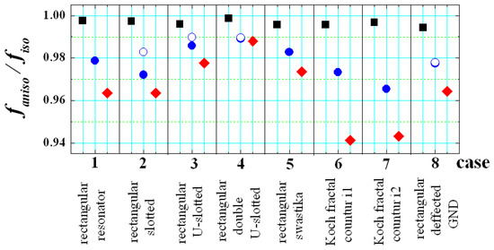 The considered defected-ground resonator [49] is also not strongly influenced by the anisotropy (2–3%); the effect is comparable with the effect in the planar resonator with a standard ground. However, the pure bending effect is strong, especially for horizontally-placed slots in the defected ground (case 8H; the increase is more than 25–50%; the values are not shown in Figure 18, because are out of the scale).