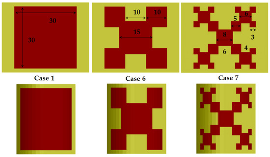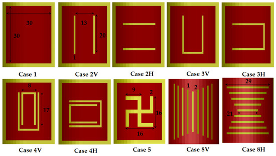 Top view of several resonance structures (bent at αC = 8°) with dimensions in mm: Case 1—resonator (30 × 30); Case 2—resonator with two slots (V—vertical orientation; H—horizontal orientation); Case 3—resonator with U-shaped slot (V&H); Case 4—resonator with double U-shaped slot (V&H); Case 5—resonator with swastika slot; Case 8—resonator with a defected ground (V&H).