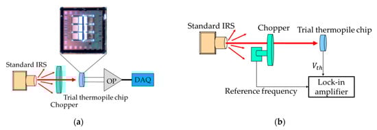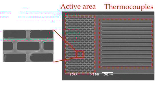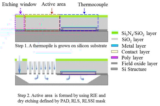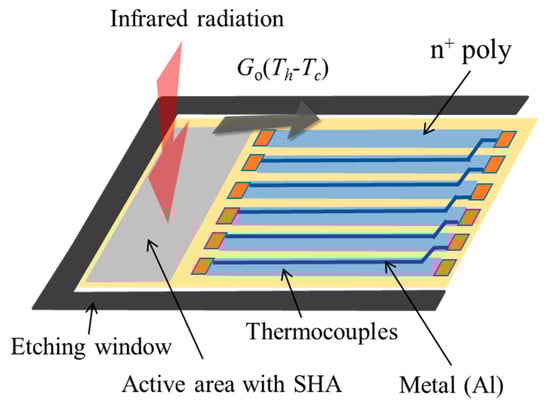 15]. CMOS-MEMS thermopile is composed of multiple thermocouples (in series), and the weak voltage signal generated by each pair of thermocouples will be added and output to the next stage of amplifying sensing circuit. The final output signal can be used for measuring the amount of IR radiation absorbed by the detector [