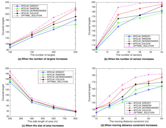 To show the impression of four parameters on the four algorithms and the optimal solution. (a) shows the impression of the number of targets; (b) shows the impression of the number of sensors; (c) shows the impression of size of area; (d) shows the impression of the moving distance constraint of sensors.
