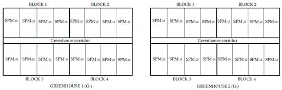 The experimental design used balanced incomplete block 2 by 2 factorial design with eight replicates (four per greenhouse), resulting in the combination of the two factors studied in the four treatments tested. Each greenhouse was divided into 4 blocks and in each one of them the treatments were placed randomly distributed, resulting in 16 experimental plots per greenhouse (Figure 1). A single plot measured 12 m by 4 m.