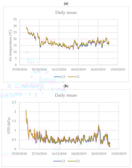 The average daily air temperature inside the greenhouses fluctuated throughout the growing cycle, being higher at the beginning of the cycle with average values close to 30 °C and with minimum values in the winter months, the lowest recorded average being 12 °C (Figure 3a). During most of the growing cycle the average daily temperature was around 15 °C. It is noteworthy that in the two greenhouses (G1 and G2) the air temperature was very similar (Figure 3a).
