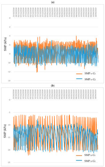 To maintain a SMP closer to zero (higher level of soil moisture and therefore greater water availability) it is necessary to apply a greater volume of irrigation water, as collected in numerous investigations [4,29,30,43,44,45] and it is corroborated with the results obtained in this experiment.