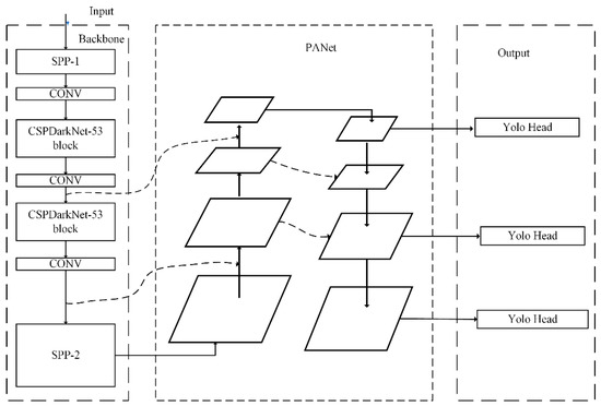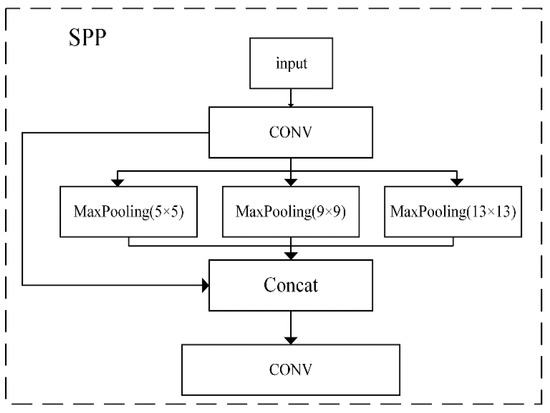 In this paper, the proposed method with real-time and accurate features is illustrated in Figure 4, which is mainly composed of three parts: backbones, neck, and heads. For the backbone, the SPP is applied to improve the receptive field of the network. Owing to the big size of the image in this article—1024 × 1024—the use of scaling and cropping operations will make the picture with more noise. To solve this problem, we added a spatial pyramid pooling network to the front of the backbone network. In addition, a fixed-size feature vector and the original image information are output effectively. The SPP can solve the multi size problem of the input image through multiscale pooling.