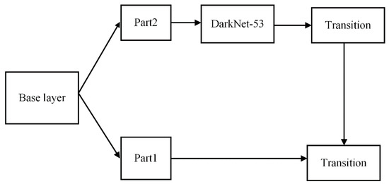 An excellent backbone network should learn as many features of pictures as possible. To enhance the learning ability of the backbone network, a Cross Stage Partial Network (CSPNet) [24] is applied. CSPNet was proposed by Wang et al. to enhance the learning ability of convolutional neural networks. This network can still maintain or enhance the learning ability of the CNN network while reducing the amount of calculation by 20%. Therefore, in order to enhance the learning ability of the backbone network, we use the CSPNet network and obtain a new network structure, CSPDarkNet53 [24]. The structure is shown in Figure 5 and consists of two parts: skip connection and main part. The main part retains the original DarkNet53 structure, and multiple residual blocks are stacked. The skip-connection part is directly connected to a concat layer of the network, and it is also spliced with the main part.