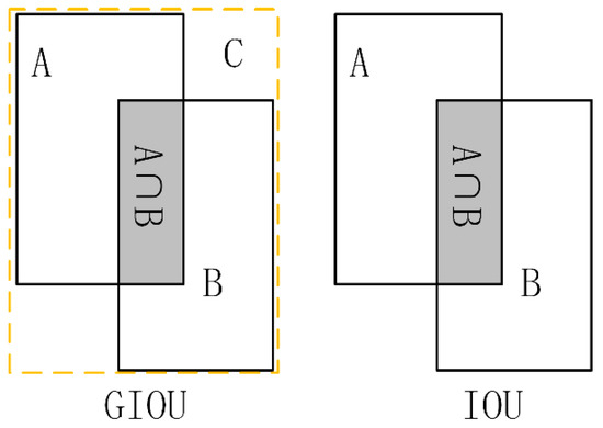 where Ac represents the minimum bounding box between the predicted bounding box and the ground-truth bounding box. U is the union of the predicted and the ground-truth bounding boxes, i.e., M∪N. The loss function not only pays attention to the overlapping area but also focuses on the non-overlapping area of the two kinds of boxes, which better reflects the overlap of the two boxes. Shown in Figure 6 are the intuitive schematic diagrams of IOU and GIOU, respectively. The bounding-box regression-loss function used in this article is: