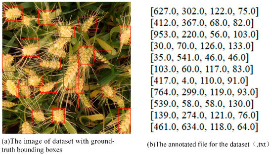 An example of dataset annotation. (a) is the vision of ground-truth bounding boxes. (b) is the txt format file including the four parameters of each wheat-head label.