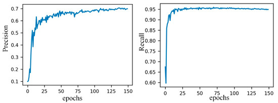 In the training phase of this paper, all models were trained for 150 epochs, using SGD (stochastic gradient descent optimization), and momentum and decay weights were set as 0.937 and 0.0005, respectively. The batch size was 16, and the initial learning rate was 0.01. The training accuracy and recall-rate change curve are shown in Figure 9.