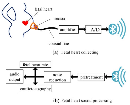 The wireless fetal heart sound monitoring system is composed of two parts: fetal heart sound collection and processing. Fetal heart sound collection requires a fetal heart sound sensor and a collection module. Fetal heart sound processing includes de-noising of the fetal heart sound and extraction of the fetal heart rate. The whole structure is shown in Figure 1. Figure 1a shows fetal heart sound collection and Figure 1b shows fetal heart sound processing at the terminal.