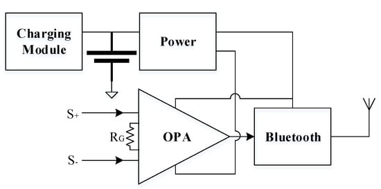 The original signal collected by the sensor is processed by the collection module in the fetal heart sound monitoring system. The module includes an amplifier, Bluetooth, a charging circuit, and a feed circuit. They are shown in Figure 3.