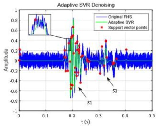 The training operation in the support vector regression (SVR) (Supplementary Materials) algorithm is relatively long, and the continual readjustment of C, the regular parameter, and , the bandwidth of the Gauss kernel, cannot satisfy real-time requirements. For this reason, the length of the trained data sample must be controlled. If it is too long, the time requirements cannot be met; if it is too short, the accuracy of C and cannot be satisfied. The fetal heart sound is periodic and the parameters can, in theory, only be determined in one period. The fetal heart rate varies from 120 to 160 beats per minute and two periods are contained in one second, so the data in one second were selected to train and to reduce noise. The fetal heart rate may change slowly and C and change with it. The threshold, , was set, and when the mean square error (MSE) was larger than , the current data were trained again to obtain an optimum C and . Cross-validation in deep-learning algorithms was used to monitor the status and prevent overfitting in training [10,11,12,13,14]. If MSE was smaller than , the current C and were regarded as perfect, the result was output, and the new data continued to reduce noise. The adaptive SVR noise reduction algorithm does not contain manually defined C and and obtains optimum parameters through self-learning according to the character of the real-time signal. Thus, the system adaptability was strengthened.
