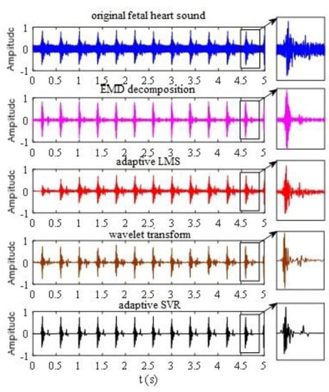 The factorization algorithm with EMD, the self-adaptive least squares method (LSM), and the wavelet transform algorithm were employed to reduce noise in the original fetal heart sound and were compared with the de-noised results of the adaptive SVR algorithm [18,19]. In the factorization algorithm with EMD, the factorization layer was 10 and the correlation calculation was operated between the implicit matrix factorization (IMF) component after factorization and the original signal. The signal was reconstructed using half the IMF component with a large correlation coefficient. The length of the filter was 51 in the self-adaptive LSM and the learning rate was 0.0014. The wavelet basis functions in the wavelet transform algorithm were sym5 and the factorization layer was 6. The threshold was obtained using minimax methods. The coefficient was processed using the hard-threshold function and the signal was reconstructed to reduce the noise. The noise reduction results of these algorithms are shown in Figure 6.