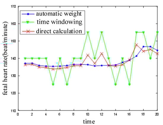 In order to homogenize the result dimensions, the average of the peak intervals in the windows was adopted when the fetal heart rate was directly calculated. It can be seen that the minimum variation of fetal heart rate is 15 with the time-domain windowing because there are 15 windows in 1 min. The effect of time-domain windowing is poor for the short time window. This may be due to that fact that three disturbances occurred in twenty data points. Both the direct calculation method and the automatic weight method performed well when the noise appeared for the first time. The influence of the noise was weakened by the average effect used in the direct calculation algorithm. However, when the noise appeared for the second time, it was not completely eliminated, although it was weakened on average. The average effects will decrease with excessive noise and over longer times. The disturbance was eliminated automatically so that the automatic weight algorithm results were more stable.