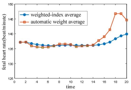 The fetal heart rate was corrected by the weighted-index average algorithm on the basis of extraction using the automatic weight algorithm. The subtle fluctuation was eliminated from the second calculation to the twelfth and the fetal heart rate tended to rise from the fourteenth to the twentieth. The jumping fetal heart rate was weakened by the weighted-index average algorithm and the variation in the fetal heart rate became more stable. The expected effect was realized and the results were consistent with reality.