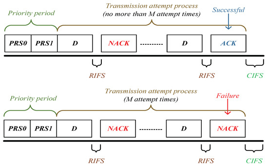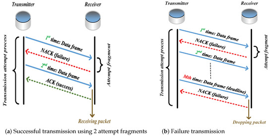 As a station occupies the channel (through executing 1901’s CSMA/CA mechanism) and attempts to transmit packets [25,26,27,28], it begins to trigger the ARQ scheme. For the receiver, it uses the packet received in the successful attempt fragment only, and discards all the previously erroneous copies of this packet (caused by unsuccessful attempt fragments). If the signal-to-noise ratio (SNR) of the packet received in an attempt fragment is less than the required minimum SNR (i.e., threshold SNR), the attempt fragment is unsuccessful, i.e., the packet is received in outage. One transmission attempt process contains no more than M attempt fragments. After each attempt fragment, the station receives an acknowledgment (ACK) frame if the packet is successfully received; otherwise, a negative ACK (NACK) frame. The packet would be dropped if it cannot be successfully delivered by the deadline (i.e., Mth attempt fragment). Figure 1 shows a successful transmission attempt process using 2 fragments and a failure transmission attempt process.