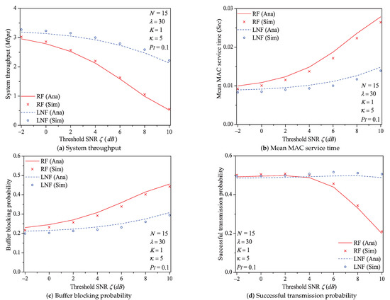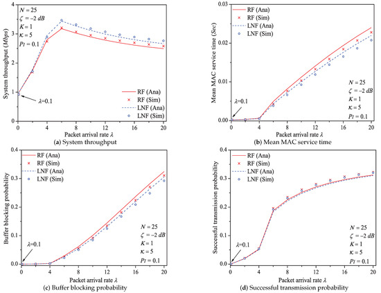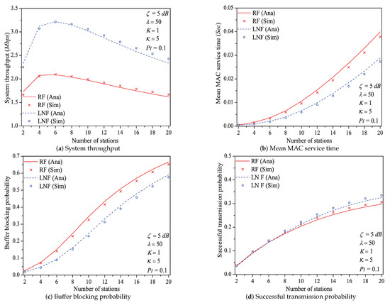 We can see that the performance of system throughput, mean MAC service time, buffer blocking probability, and successful transmission probability is affected by the size of transit buffer K. It is easy to find that larger size of transit buffer would nor result superior performance of system throughput and MAC service time. However, with the increase of buffer size K, the transit buffer is no longer easy to be fully loaded. Consequently, the buffer blocking probability decreases with the increasing K, and the successful transmission probability is enhanced (since more packets can enter the transit buffer rather than directly being blocked).