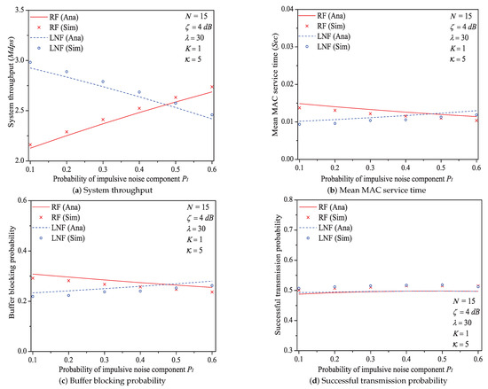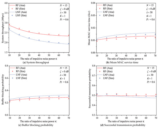 The past decade has witnessed a rapid development of IoT (Internet of things), which provides convenience for consumers, manufacturers, and public welfare [1,2,3,4]. Due to the limitation of battery life and wireless propagation, wireless communication (WLC) solution cannot accommodate all IoT requirements. For this purpose, industry and academia have developed power-line communication (PLC) networks as another promising technology for constructing IoT systems [4,5,6,7,8]. The reliable PLC network generally introduces some network coding schemes [9,10,11,12,13,14,15] into its link layer to ensure communication reliability, and the most typical one is the AqRQ (automatic repeat request) scheme. It allows a station to retransmit a data packet several times at link layer to enhance the received probability. Because of the introduction of the ARQ scheme, the performance of MAC (medium access control) protocol for reliable PLC networks i.e., IEEE 1901 [16,17,18,19,20], would be necessarily affected. In addition, the PLC channel fading type and additive non-Gaussian noise feature also influence 1901’s performance.