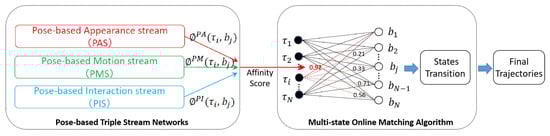 Our framework, as shown in Figure 1, consists of the Pose-based Triple Stream Networks (PTSN) and a multi-state online matching algorithm. PTSN is responsible for calculating the similarity scores between the history tracklets and the candidate detection in the current frame, where the scores come from three network streams that model three pose clues, i.e., pose-based appearance, motions and athletes’ interactions. Based on the similarity scores, the multi-state online matching algorithm generates final trajectories for athletes by tracklet/detection matching and state transitions. Details of our proposed PTSN and the matching algorithm are described in the following.