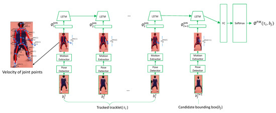 The architecture of Pose-based Motion Stream (PMS). The inputs are and . is tracklet of ith athlete, composed of his bounding boxes from time 1 to t, and is a candidate detection at time t + 1. The motion features are fed into an Long Short-Term Memory (LSTM) followed by a softmax layer to generate the similarity score . Velocity definition of body joints can be seen in left-side.