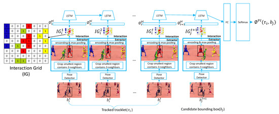 where is an indicator function to check if the athlete’s joint at is in the cell of the grid. is the set of neighbors of the athlete i, . is the set of joints of neighbor j. After building the interaction grids, we use a fully-connected layer that takes the interaction grids as input and produces H-dimensional output for each timestep. Similar to PAS and PMS, we also map the interaction grid of candidate detection j at timestep to H-dimensional feature vector using the same measure, forming the interaction feature sequence . The feature sequence is fed into an LSTM layer to model the contextual structure, which is carried in its hidden state . The final step of is passed to a softmax classification layer with cross-entropy loss to predict the tracklet-detection affinity score .