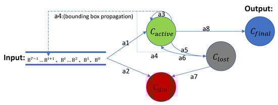 State transition diagram of our matching algorithm, where the input are bounding boxes belong to each frames . is a pooling storing tracklets that have been tracked so far. is a pooling storing tracklets that tracked but lost. is a pooling storing tracklets judged to be illegal. is a pooling storing legal output tracklets. The transfer actions {a1, a2, ..., a8} between them will be explained in detail below, and there will be corresponding annotations in the Algorithm 1.
