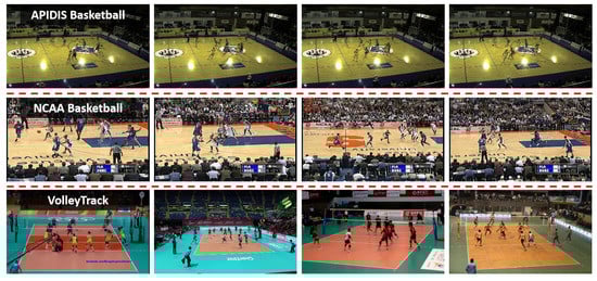 Example frames of the APIDIS, NCAA basketball and VolleyTrack databases (each row belongs to a database).