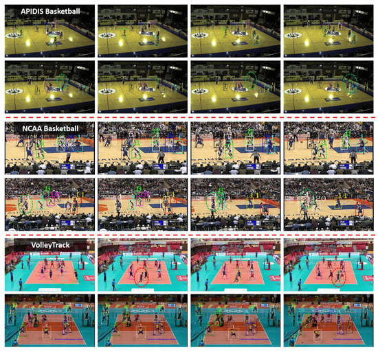 The VolleyTrack dataset contains 18 video sequences of world-class volleyball games collected from YouTube, as shown in Figure 6 (bottom row). Each video is captured by a camera equipped at the end line of the competition terrain, and there exist variations in background and illumination. The video sequences, corresponding to game rounds, last from 8 to 12 s. The dataset contains 5406 frames, at 30 fps, of a resolution of 1920 × 1080. The bounding boxes of players are manually annotated at each frame. Due to the same setting at both sides of the ground, the dataset only considers the athletes in the half ground near to the camera for each video. Among the 18 sequences, 50% of the data were for training and the others for testing.