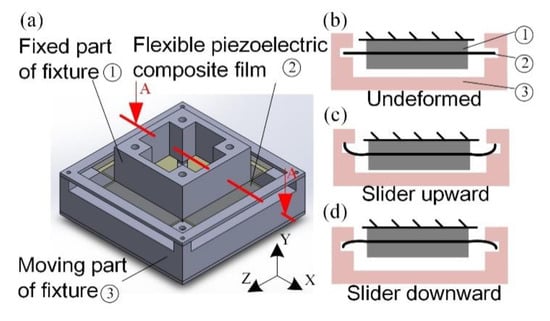 In this work, the piezoelectric power-generation component included a fixed part and a moving part, as shown in Figure 2a. The fixed part was used to clamp the piezoelectric film. The moving part was driven by the slider to deform the piezoelectric film. A cross-sectional view of the A–A line in Figure 2a is shown in Figure 2b. The piezoelectric film was undeformed when the slider was located at the equilibrium position. When the slider moved, the moving part of the fixture would deform the piezoelectric film, as shown in Figure 2c,d. When the slider moves upward, the piezoelectric film bends with a positive moment. On the other hand, a negative bending moment was exerted when the slider moved downward. The piezoelectric film generates electrical power through the piezoelectric effect. The fixture was made of acrylic because this material offers high mechanical strength, low cost, ease of machining, and transparency.