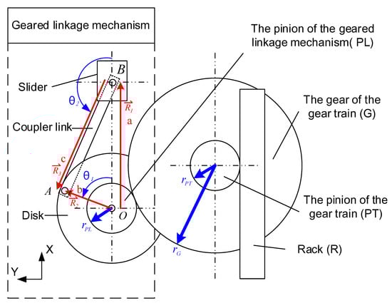 To simplify the mathematical model, the weight and the friction were neglected. A schematic diagram of the geared-linkage mechanism is shown in Figure 3. The points O, A, and B are the revolution joints that connect the disk to a crank link, a coupler link, and a slider. The displacements , and are the vector functions from O to B, from O to A, and from B to A, respectively. The norms of the vectors , and are a, b, and c. and are angles from the x-axis to vector and from the x-axis to vector , respectively. Since the sum of vectors , and is zero, the closure equations are shown as follows: