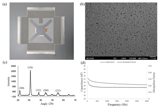 The developed flexible piezoelectric composite film is shown in Figure 5a. A scanning electron microscope was used to monitor the morphology of the film, as shown in Figure 5b. The PZT film was extremely dense and the average particle size was less than 1. An X-ray diffractometer was used to examine the film’s crystalline structure. Patterns were recorded at a rate of 4° min−1 in the 2θ range of 20° to 70°. The X-ray-diffraction (XRD) results of the PZT film are shown in Figure 5c. A significant peak was observed at 31.00°, indicating that the piezoelectric film had a perovskite crystal. A capacitance test was used to characterize the electrical properties of the PZT film by measuring the capacitance and dissipation factor. In the capacitance test, a LCR meter (HP LCR 4284A) drove the PZT film with a sinusoidal voltage from 40 Hz to 3 kHz. The LCR meter recorded the current and plotted the capacitance and dielectric loss as a function of driving the voltage simultaneously. The result of the capacitance test is shown in Figure 5d. The capacitance of the PZT film was 39.77 nF at 1 kHz. The dissipation loss was 0.0175 at 1 kHz. Capacitance is the ability to store electrical energy, and dissipation is the measure of the energy-loss rate in a mode of the electrical dissipative system.