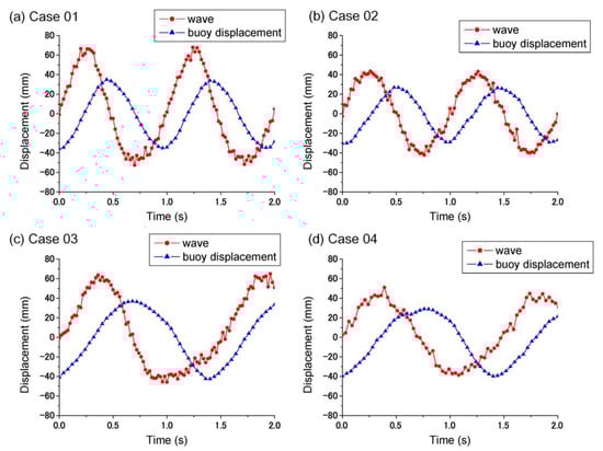 The amplitudes of the buoy displacement were 34 ± 1.052 mm, 27 ± 1.030 mm, 37 ± 1.068 mm, and 29 ± 1.219 mm for Cases 1–4, respectively. The amplitude of buoy displacement was around 30% less than the actual wave amplitude. This difference between the wave amplitude and the buoy displacement was because of the response amplitude operator (RAO) generally being less than 1.0, about 0.7. The distributed pressure on the surface of the buoy results in a lower force, thus leading to a lower displacement than the wave. In future research, the applied buoy should be analyzed by hydrodynamics to improve the RAO.