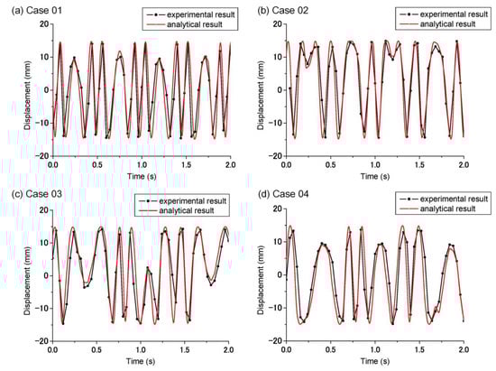 In this study, the kinematic properties of the developed frequency up-conversion mechanism were tested. The experimental results were compared to the analytical ones. The displacement of the moving part of the fixture connected to the slider was measured by video. Experimental results for Cases 1–4 are shown in Figure 7 and were similar to the analytical results. Even the trend was similar; there was still a reasonable difference between the experimental and analytical results. This might be attributable to manufacture tolerance, assembly offset, and friction.