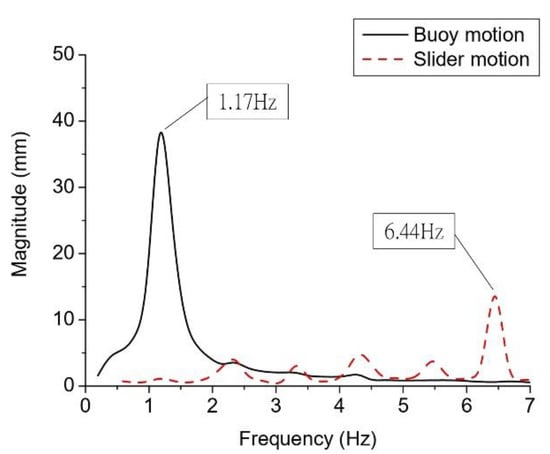 The frequency spectra of the buoy and slider motion obtained by fast Fourier transformation (FFT) of Case 1 data is shown in Figure 8. The frequency of the buoy motion was 1.17 Hz, which is higher than that of the control wave (1 Hz). This may be the result of error in the control system of the wave generator. Another possibility might be the small size of the data sample. The resolution of the frequency spectrum was limited by the sampling data, and only 0.97 Hz and 1.17 Hz were calculated by FFT. The actual resonance frequency might be located between 0.97 Hz and 1.17 Hz. The main frequency of the slider motion was 6.44 Hz, which was six times larger than that of the buoy. This result proves that the frequency up-conversion mechanism converts low-frequency wave motion into mechanical motion with a frequency six times greater.