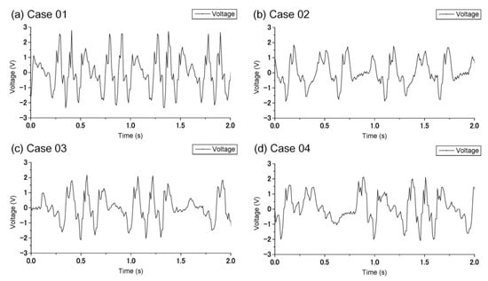 In this study, the electrical performance of the developed PWEC, including the voltage and current outputs, were measured by an oscilloscope. The output voltages of the PWEC for Cases 1–4 are shown in Figure 9a–d, respectively. The maximum voltage in each case is summarized in Table 3. The maximum voltages were 2.8 V, 2.28 V, 2.24 V, and 2.02 V for Cases 1–4, respectively. The RMS voltage equivalent to the DC voltage was measured through connecting to an external 495 kΩ resistive load. Table 3 shows the RMS voltage in each case. These voltages were 824 mV, 595 mV, 630 mV, and 506 mV for Cases 1–4, respectively. The average electric powers in Table 3 were calculated by Equation (11) and had values of 1.37 μW, 0.71 μW, 0.8 μW, and 0.52 μW, respectively. It can be seen that the PWEC functioned well and outputted electrical energy. Among the four cases, Case 1 had the largest RMS voltage (824 mV) and average electric power (1.37 μW). Recall in Figure 6a, Case 1 had a larger and more frequent displacement. The wave energy was larger and the output voltage was higher.