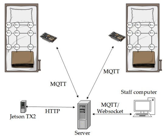 The system consists of one or more Arduino-based hardware solutions with attached pressure sensors on the mattress topper, the server, computation development board, and software application on the personal computer (PC). For every bed, 64 novel sensors detect the pressure distribution. Because the bed is usually placed in the same place, the hardware solution runs from the electrical network and does not need a battery power source. The network-attached storage from QNAP holds the server solution. It features the Message Queuing Telemetry Transport (MQTT) broker for communication, Node-RED for the logic, and Mongo database for data storage. For the position classification, we use the neural network. The neural network needs a lot of computation power. Because of this requirement, computation runs on a separate device.