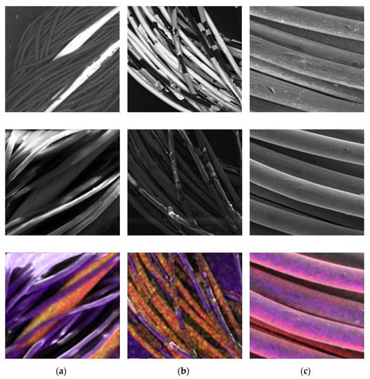Electroconductive yarns with chemical analysis. (a) Two 50 mm Cu/Ag wires blended with polyester yarns; (b) Elitex yarn; (c) 3 ltex yarn with antioxidant treatment.