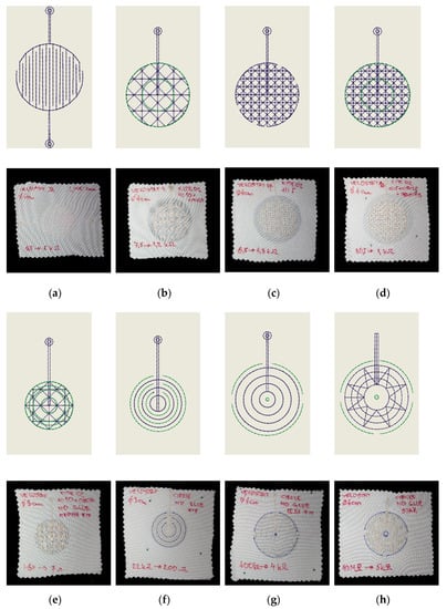 Sensing node designs in Wilcom DecoStudio and their fabrications. (a) PC2D; (b) PC3H; (c) PC3I; (d) PC3J; (e) PC3K; (f) PR4A; (g) PR4B; (h) PR4C.