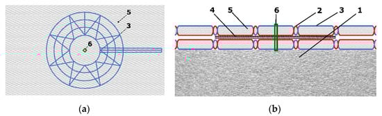Measuring node realized by PR4C design. (a) Top view; (b) transversal view: (1) polyurethane foam, (2) electrically conductive yarn, (3) nonconductive yarn, (4) Velostat foil, (5) base fabric, (6) fixation with nonconductive yarn.