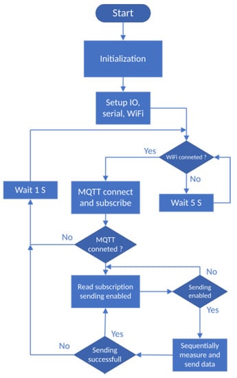The Figure 6 illustrates the source code flowchart diagram. The diagram starts with the initialization of all the necessary components. Then, the general input/output pins and communication peripheries enter the default state. Using provided Wi-Fi credentials, the NodeMcu connects to the Wi-Fi network. If the connection to the network fails, the system waits for 5 s and then repeats this operation until the successful login. The next step is a connection to the MQTT broker using pre-defined credentials. The MQTT protocol communication is provided by an external library—Adafruit MQTT Library ESP8266. To establish the MQTT connection, we need the client instance of the class Adafruit_MQTT_Client. The client connects to the MQTT broker. We have to create an additional object for receiving the responses from the broker. The instance of the class Adafruit_MQTT_Subscribe provides such an interface. An Adafruit_MQTT_Publish class provides the application programming interface (API) for sending data. After a successful connection, the object from Adafruit_MQTT_Subscribe class fetches the data from the MQTT broker using the channel identifier for reading commands. On the server side, the MQTT broker resends the commands from the desktop application on the PC. The valid commands are to start and stop the measurements. The measurement is performed in cycles every 1 s. We are using two analog multiplexers to select the particular sensor in the matrix of sensors on the output and input side.