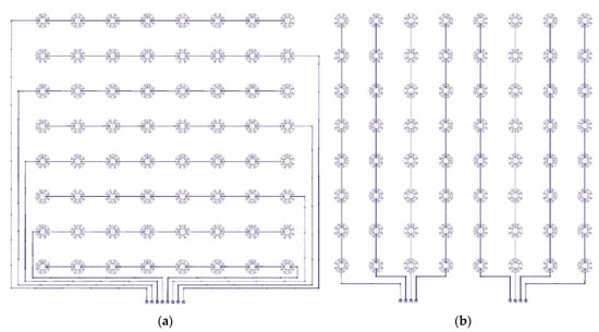Final topper’s pressure matrix design with eight by eight sensing nodes. (a) Top layer; (b) bottom layer.