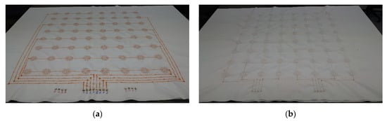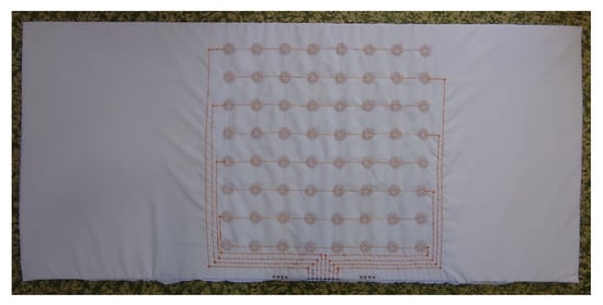 The fabrication of the sensor starts by drawing a mesh of eight by eight dots on the base fabric. They mark the center of each sensing point. It is necessary because the overall sensor is too big to fabricate at one step and the material of the base fabric is a little bit elastic. Moreover, the precise final composition of both layers relative to one sensor at all 64 nodes is difficult to manufacture. We embroidered the partial sensors in the marked positions. In our prototype, we used the nonconductive viscose-based yarn for upper embroidery and silver-coated polyamide yarn as bottom embroidering filaments. After that, the rest of the connecting lines and connectors were embroidered too. It is a fact, that topper will be placed on the standard PolyURethane (PUR) foam mattress. From this point of view, the sensor prototype should be massive with a robust design able to resist a crackdown of the electroconductive yarns when a human is moving over the bed. For this reason, we secured the connections between sensor nodes by triple stitching. Figure 8 illustrates the fabrication of the sensor’s layers.