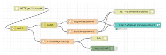 Figure 11 shows the command processing flow. HTTP request–response communication model implements the command processing in our solution. The flow starts with the input HTTP node. There is one compulsory argument in the HTTP request—command type.