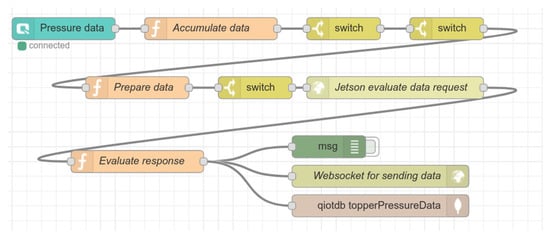 Because of the NodeMCU ram limitation, we have to send the measured data in sequences. Therefore we need eight messages to send data from one measurement. One message contains the pressure data from one row in the matrix of sensors. The row tag indicates the row position. The function Accumulate data serves as a buffer function for one measurement. The IP network could cause different delays and therefore function task is to check the row order, sort the data if necessary, and prepare data from one measurement for later evaluation. The next two switch blocks inspect the data format and integrity. The next block is the Prepare data function. The function checks the topper state and prepares the data for the evaluation in the neural network. Afterward, the switch block validates the topper state. HTTP request–response block sends the data for evaluation in JSON format as a parameter in the HTTP request to the Jetson module. Data looks like: