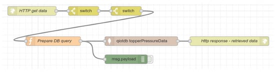 The flow starts with Qbroker in node. This input node listens on the topic “pressureData.” The purpose of this flow is to collect, evaluate, and propagate the topper pressure data. The example of receiving data on the node is: