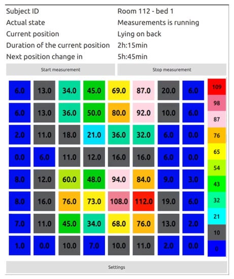 The application is using HTTP request–response model to send commands to start or stop measurements. Actual data like subject identification, current state, current position, duration of the current position, and time to the next position change give the staff the information about the subject lying on the smart topper. There is also a graphical representation of the current state of the lying subject. The red color represents the maximal pressure, while the blue color represents minimal or non-pressure on a particular sensor in the matrix of sensors. The displayed value represents the pressure in numerical form. This number goes from 0 to 140. The 0 value describes the state when there is no pressure applied to the sensor. The value of 140 represents the maximum load, which the sensor is capable of measuring.