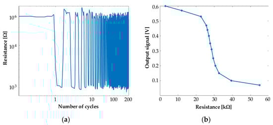 (a) The resistive response of a single-sensor element to a load of 10 N over 200 cycles. (b) The value of output signal as a function of the changing resistance.