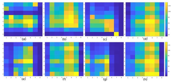 Pressure distribution example for lying postures, Supine: (a) subject 1, (b) subject 2, Left side: (c) subject 1, (d) subject 2, Prone: (e) subject 1, (f) subject 2, Right side: (g) subject 1, (h) subject 2.